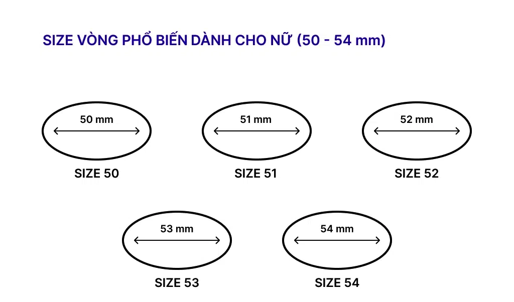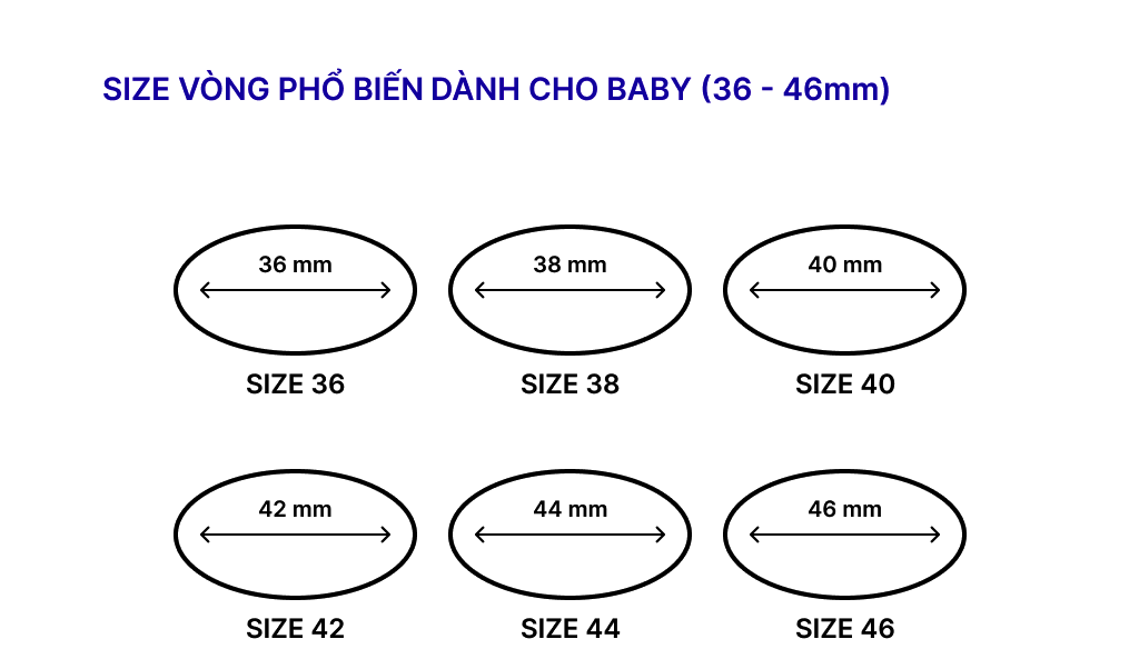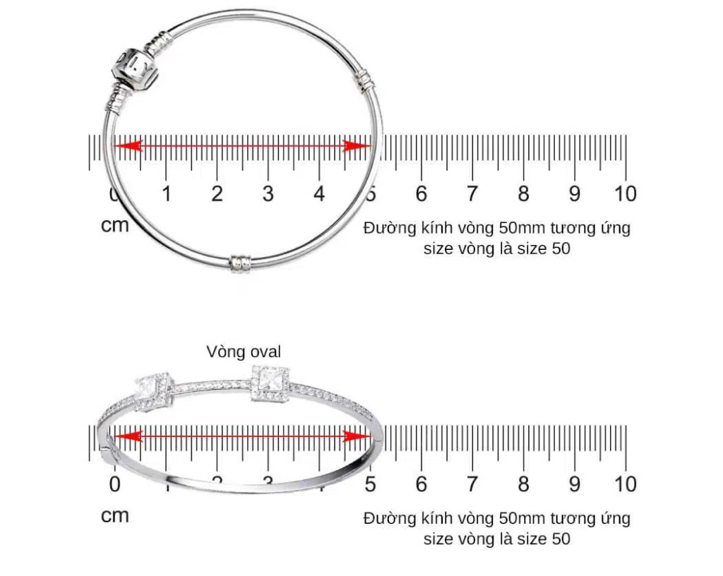 Đối với Vòng kiểu Oval: Bạn có thể đo chiều ngang cổ tay, kích thước vòng tay của bạn (tính theo mm) chính là size số ghi dưới vòng tròn.