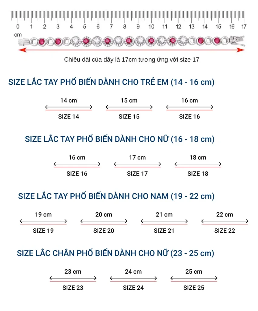 Bước 2: Lấy kết quả đo được đối chiếu số cm trên thước với thông số của bảng kích thước lắc tay như hình dưới.
